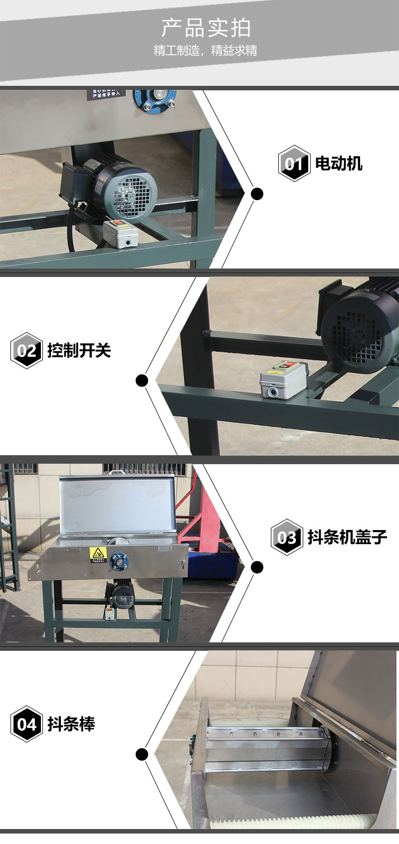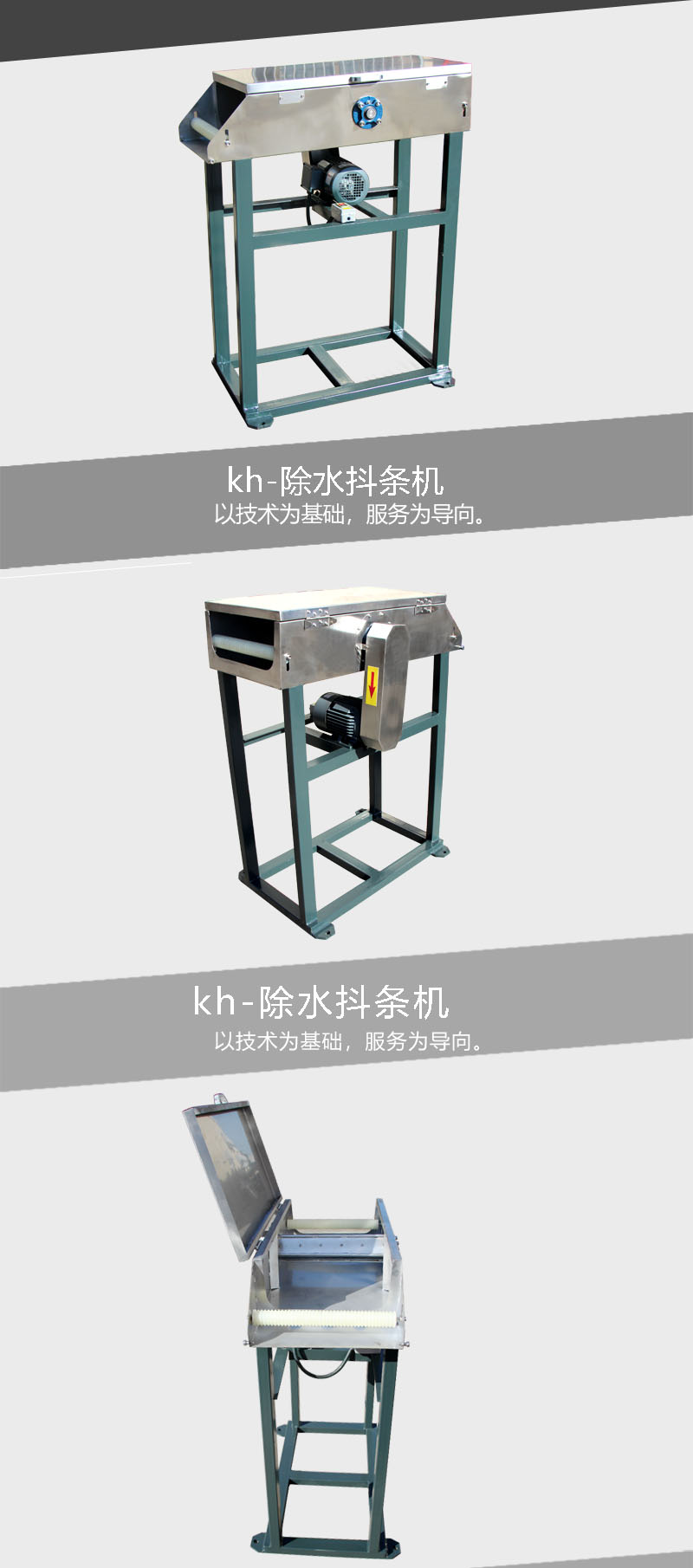 用途:適用于冷卻水槽和立式風機或者切粒機之間的架橋。 特點: 1:塑料拉絲經過除水抖條機時,高頻率抖動,除去塑料拉絲表面水分。 2:材質為不銹鋼,使用壽命長。