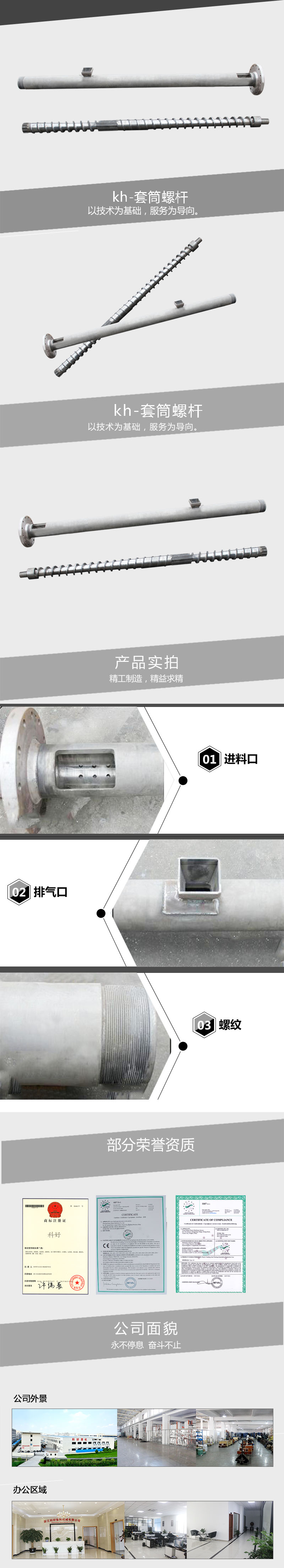 用途:塑料造粒機螺桿可加工多種熱塑性塑料,主要供ABS? PP? PS? PE? PC? PP-R? PPO? PET? ABS+PC? POM等塑料塑化造粒。 特點: 1:螺桿、機筒采用38CrMoAL材料制作,經調質、氮化、等多種處理工藝,根據不同塑料的特性,設計不同螺桿,螺桿進料口噴有合金材料,提高了螺桿的使用壽命。 2:螺桿經過多年研發設計。 3:提高了產能、增強了塑化效果。 4:增加了物料的混合效果和塑化效果,受熱均勻,產量高,螺桿使用壽命長。